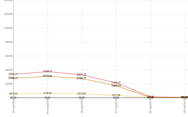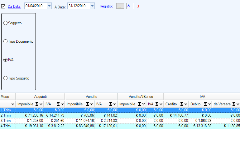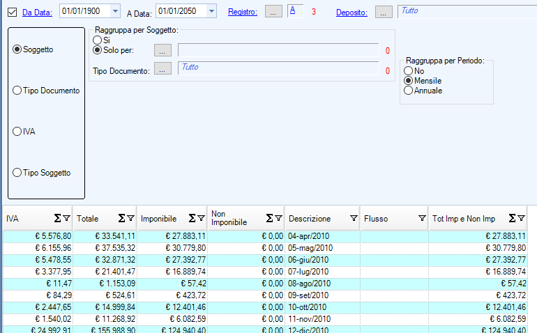 Puoi visualizzare per mese o per anno l'andamento delle vendite degli acquisti, tutti gli incassi ed i pagamenti. Inoltre potrai analizzare il fatturato con o senza iva.